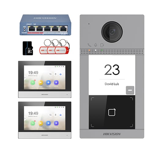 2.024,46 lei (TVA inclus)KIT videointerfon Smart pentru o familie, Rj45 + Wi-Fi 2.4Ghz, Switch PoE, Card, Tag, monitor 7 inch negru, – HIKVISION DS-KIS603-1-B