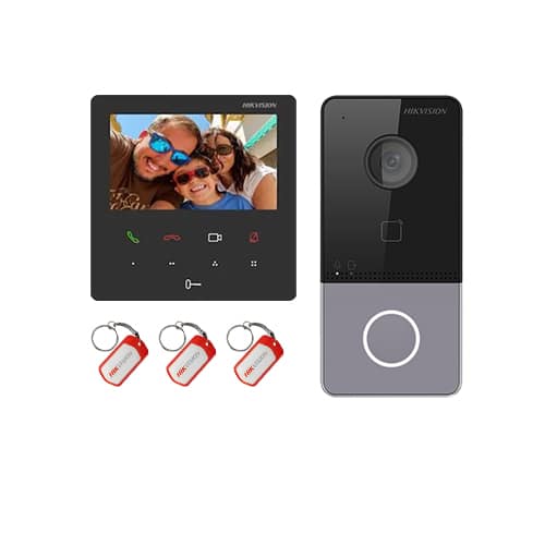 1.359,00 lei (TVA inclus)KIT videointerfon Smart pentru o familie, TCP/IP RJ45, Card, Tag, Carcasa, Monitor 4.3 inch negru Wi-Fi, – HIKVISION DS-KIS606-P(B)