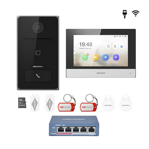 KIT videointerfon Smart pentru o familie cu yala electromagnetica, Rj45 + Wi-Fi 2.4Ghz, Switch PoE, Card, Tag, monitor 7 inch negru, – HIKVISION DS-KIS604-BY