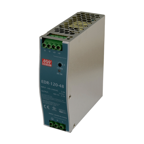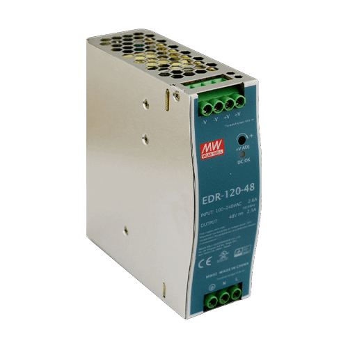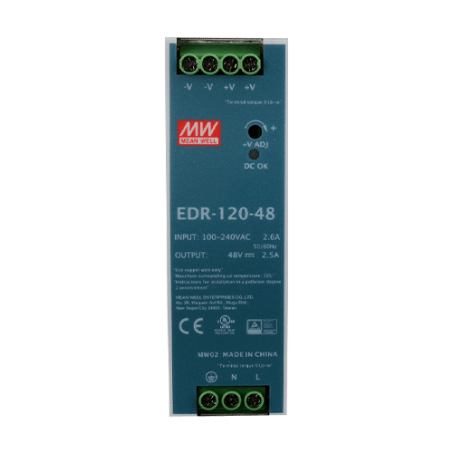 Sursa de alimentare in comutatie MeanWell reglabila intre 48 ~ 55V si un curent maxim de pana la 2.5A, 120W, sina DIN.