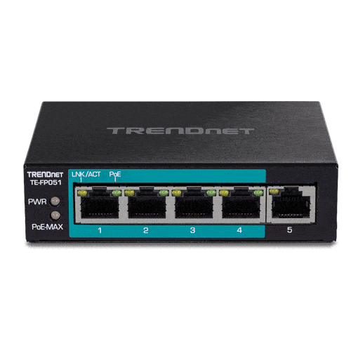 Switch-ul PoE+ cu raza lunga TRENDnet TE-FP051 cu 5 porturi Fast Ethernet furnizeaza date si alimentare prin cablurile Ethernet existente catre dispozitive PoE sau PoE+ cum ar fi: access point-uri, telefoane VoIP si camere IP. Acest model de switch are o putere totala de 60W si functioneaza pana la o distanta de 250m. Are un design fara ventilator si se poate monta pe perete.