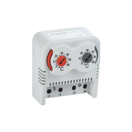 Termostat dual de racire-incalzire pentru comutarea ventilatoarelor din rack-uri sau a incalzitoarelor. Montare pe sina DIN 35mm.